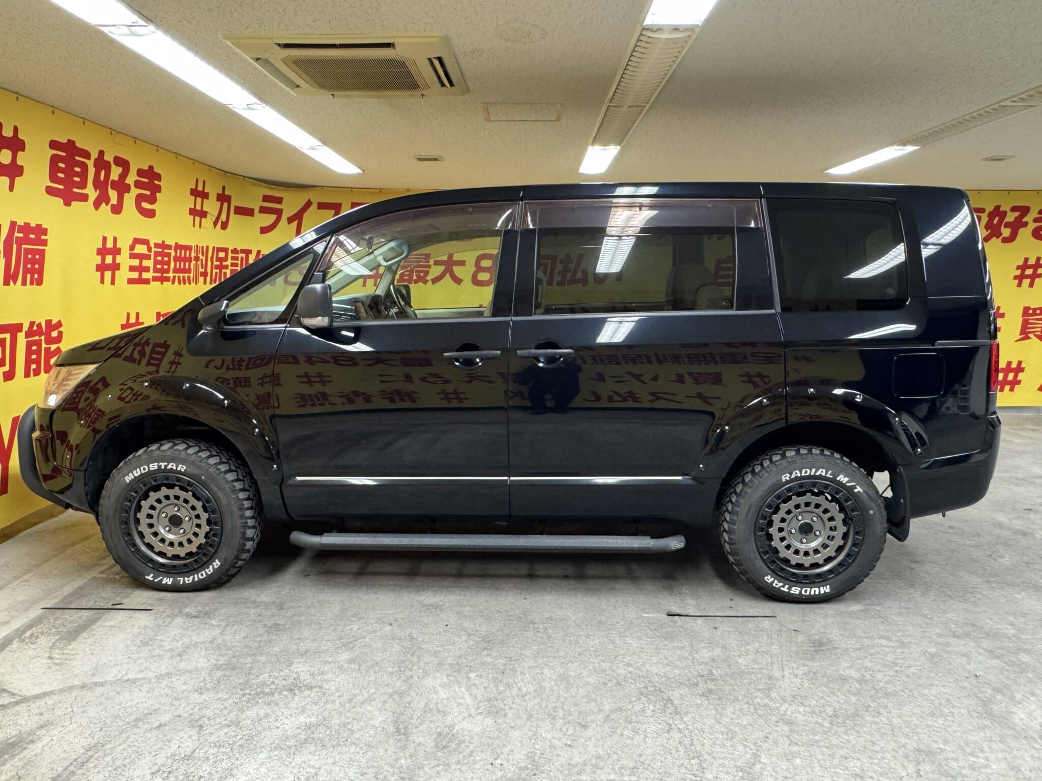 純正HDDナビ 地デジフルセグTV DVD ミュージックサーバー CD ETC フロント サイド バックカメラ 革巻きステアリング ステアリングスイッチ パドルシフト 純正フリップダウンモニター ドライブオートセレクター オートライト オートエアコン リアクーラー リアヒーター ウインカー付き電格ミラー 両側スライドドア パワーバックドア Gi・GEARグリルガード Gi・GEARサイドステップ Gi・GEARリアラダー リフトアップ オーバーフェンダー HIDヘッドライト LEDフォグ ホワイトレタータイヤ 社外17インチAW