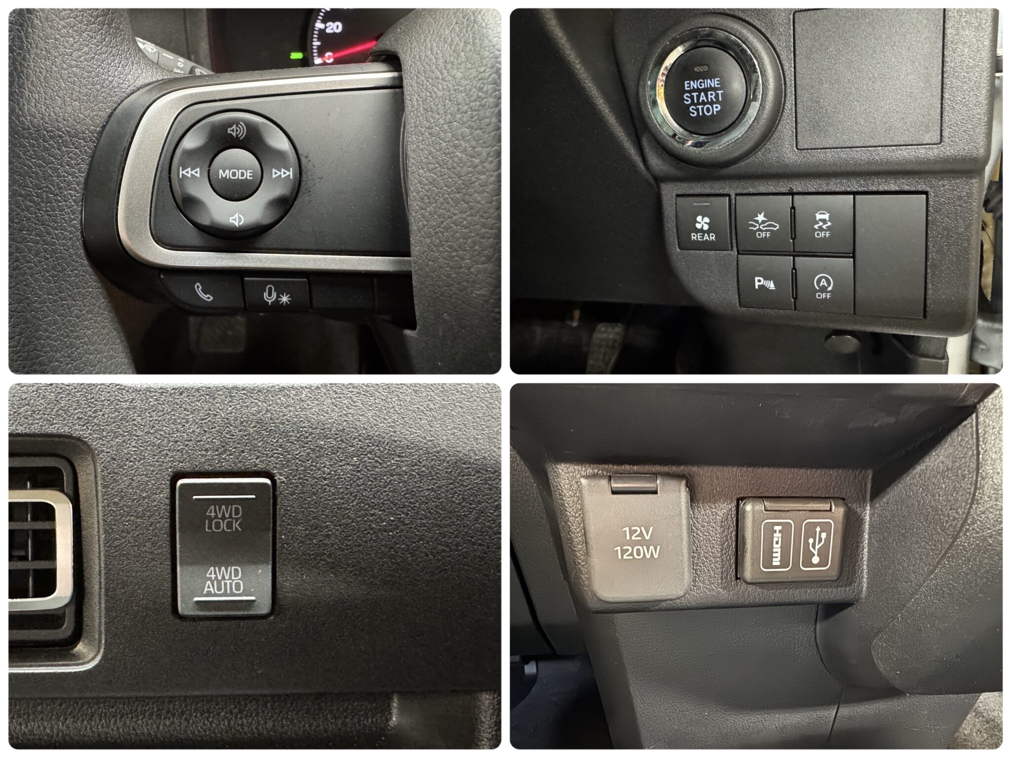 純正ディスプレイオーディオ CD DVD USB HDMI バックカメラ 電動格納ミラー ステアリングスイッチ アイドリングストップ クリアランスソナー オートライト LEDヘッドライト LEDフォグ エアコン リアヒーター パワーウィンドウ ドアバイザー 2WD・4WD切替スイッチ オーバーヘッドコンソール 社外グリル プッシュスタート キーレス スマートキー スタッドレスタイヤ 車検2年付
